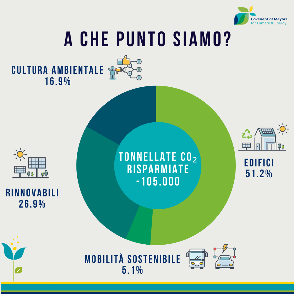 Gli obiettivi di riduzione delle emissioni di CO2 del precedente PAES, da realizzarsi entro il 2020, sono stati raggiunti e superati al 31 dicembre 2019. Il 2020 mostrerà emissioni sicuramente inferiori ma di poca valenza scientifica in quanto pesantemente influenzati dalle restrizioni dovute alla pandemia da COVID-19. È necessario, tuttavia, comprendere la distinzione tra consumi energetici della città e stima degli impatti delle azioni di mitigazione. I primi seguono dinamiche che spesso non sono direttamente correlate e controllabili dalle politiche energetiche, ad esempio: non è possibile imporre una limitazione alla temperatura interna invernale negli edifici inferiore a quella imposta dalla legge, lo stesso vale all’inverso per la stagione estiva; non è inoltre possibile impedire a chiunque di circolare liberamente con il proprio veicolo anche nei casi in cui il mezzo di trasporto pubblico sarebbe sufficiente a soddisfare la medesima esigenza di spostamento. I secondi sono del tutto teorici e solo parzialmente misurabili nei casi specifici. Per contenere e ridurre i consumi energetici il decisore politico e i tecnici individuano le azioni concrete che dovrebbero portare al raggiungimento degli obiettivi di piano. I due numeri non sono direttamente correlati, ecco perché dal 2001 ad oggi si osserva una riduzione delle emissioni dovute ai consumi reali pari a circa 185.000 tCO2, a fronte dell’aver eseguito azioni per la quali si è stimato, in fase di progetto, un impatto complessivo pari a circa 105.000 tCO2 di riduzione. Nella grafica successiva è rappresentata la situazione relativa alle azioni pianificate ed effettivamente realizzate nell’ambito del vigente PAES.