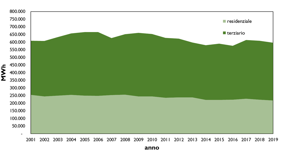 L’energia elettrica, insieme al gas metano, è uno dei due principali vettori energetici in termini di emissioni di CO2 nel territorio comunale. La serie storica dei consumi evidenzia una leggera flessione nel settore residenziale ed un andamento variabile, legato ai cicli economici, nel settore del terziario.