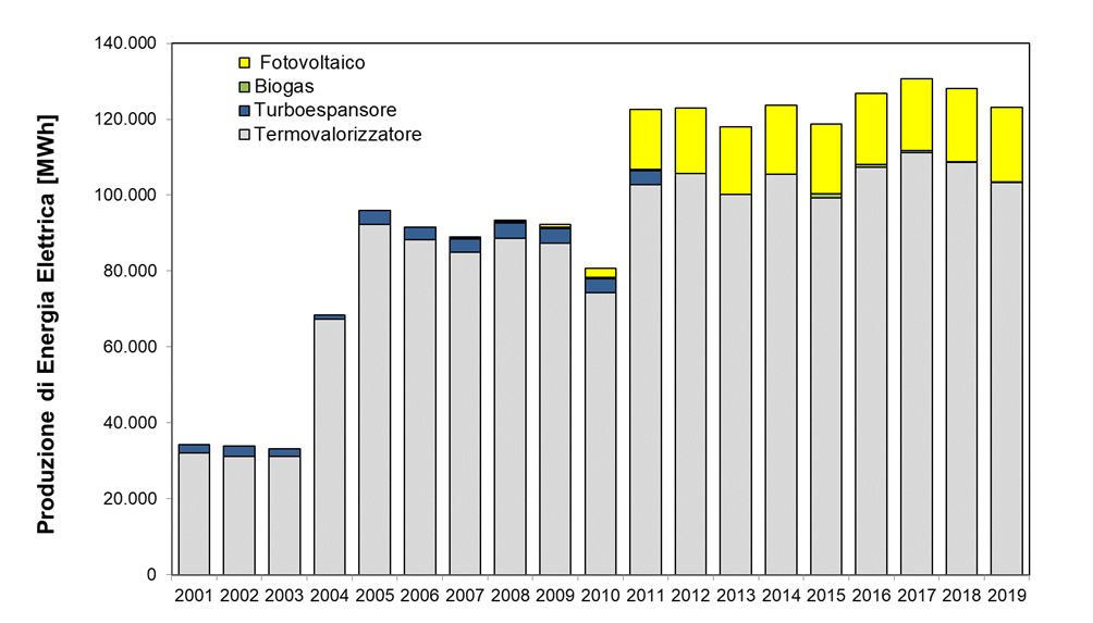La produzione di energia elettrica nel territorio comunale è data fondamentalmente dal Termovalorizzatore (quota pari a 103.317 MWh nel 2019) e dagli impianti fotovoltaici pubblici e privati, la cui diffusione è iniziata nel corso del 2007 con l’introduzione degli incentivi “Conto Energia”.