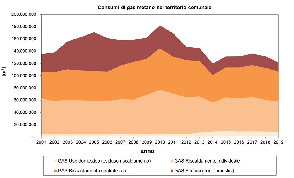 Seppur di poco rispetto all’energia elettrica, il gas metano è il vettore energetico più rilevante in città in termini di emissioni di CO2. Le variazioni del consumo di gas metano presentano fluttuazioni annuali legate alle condizioni climatiche invernali. Come visibile nel grafico sottostante, i consumi di gas in città sono calati molto poco rispetto al 2001. Considerando il calo demografico, la temperatura media invernale in aumento e le politiche energetiche e di incentivazione nazionali per interventi di riqualificazione energetica è possibile dire che tale andamento non è quello che ci si aspetterebbe.
