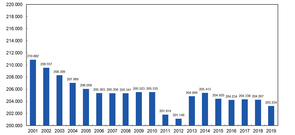 Dal punto di vista dell’andamento demografico, la popolazione del comune di Trieste, che rappresenta storicamente circa l’87% del totale presente in Provincia, ha manifestato un calo negli anni dal 2001 al 2019 attestandosi a 203.234 residenti a dicembre 2019. La densità di popolazione nel Comune di Trieste è pari 2.388 ab./km² ed è molto elevata rispetto alla media delle città italiane con popolazione compresa tra i 150.000 e i 250.000 abitanti pari a 1.229 ab./km2.